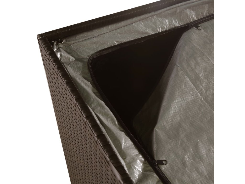 Klimaticky odolný PE ratan, ze kterého je úložná truhla vyrobená, se snadno čistí, je odolný vůči opotřebení a vhodný jak pro venkovní, tak i vnitřní použití. Zahradní úložný box má pevný ocelový rám s práškovým nástřikem, který zaručuje dlouhou životnost. Vnitřní výstelka z PE se zapínáním na zip ochrání obsah před vlhkostí. Úložná truhla má moderní design, který se hodí do jakéhokoli bydlení, ať už uvnitř nebo venku.