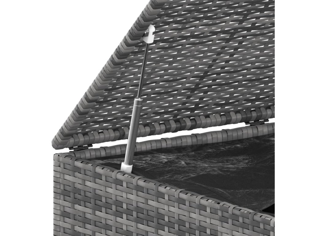 Tento zahradní úložný box má robustní ocelový rám s práškovým nástřikem, který se vyznačuje vysokou odolností. Úložná truhla je zhotovena z PE ratanu odolného vůči povětrnostním vlivům, snadno se tedy čistí a je vhodná pro venkovní i vnitřní použití. Vnitřní voděodolný vak z PE s krytem a zipem chrání vaše věci před vlhkostí. Box na podušky je navíc vybaven mechanismem s plynovým pístem, který usnadňuje otevírání a zavírání a chrání prsty a ruce před nechtěným přivřením.