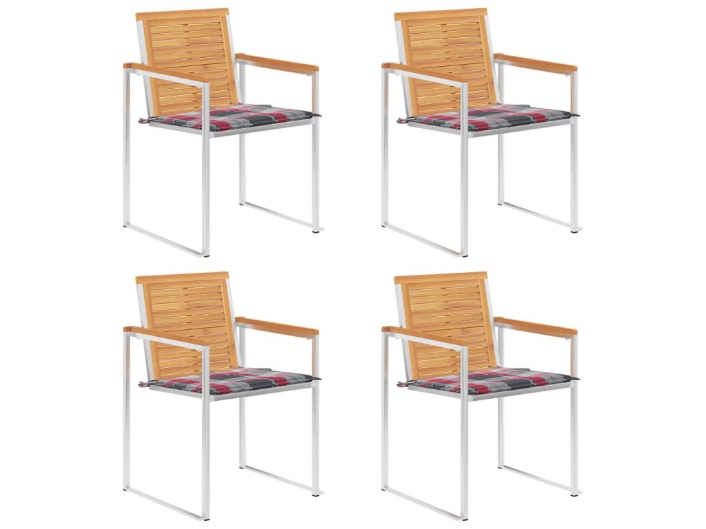Nábytek je zhotovený z extrémně odolného teakového tvrdého dřeva, které již prošlo procesem smršťování, bylo uměle vysušené a poté jemně a dohladka obroušené. Teakové dřevo je oceňované pro svou výjimečnou pevnost a klimatickou odolnost, a proto je jedním z nejoblíbenějších materiálů pro výrobu zahradního nábytku. Je to skvělá volba, pokud si chcete pořídit venkovní výbavu, která vám vydrží sloužit dlouhá léta. Vzhledem k rámu z vysoce kvalitní nerezové oceli jsou židle zároveň robustní a odolné vůči korozi. Přiložená poduška slouží nejen jako praktický doplněk – plní také dekorativní funkci. Posaďte se a dopřejte si venku skvělou večeři nebo si jen tak odpočiňte a užívejte si počasí s touto klasickou sadou zahradních židlí.
