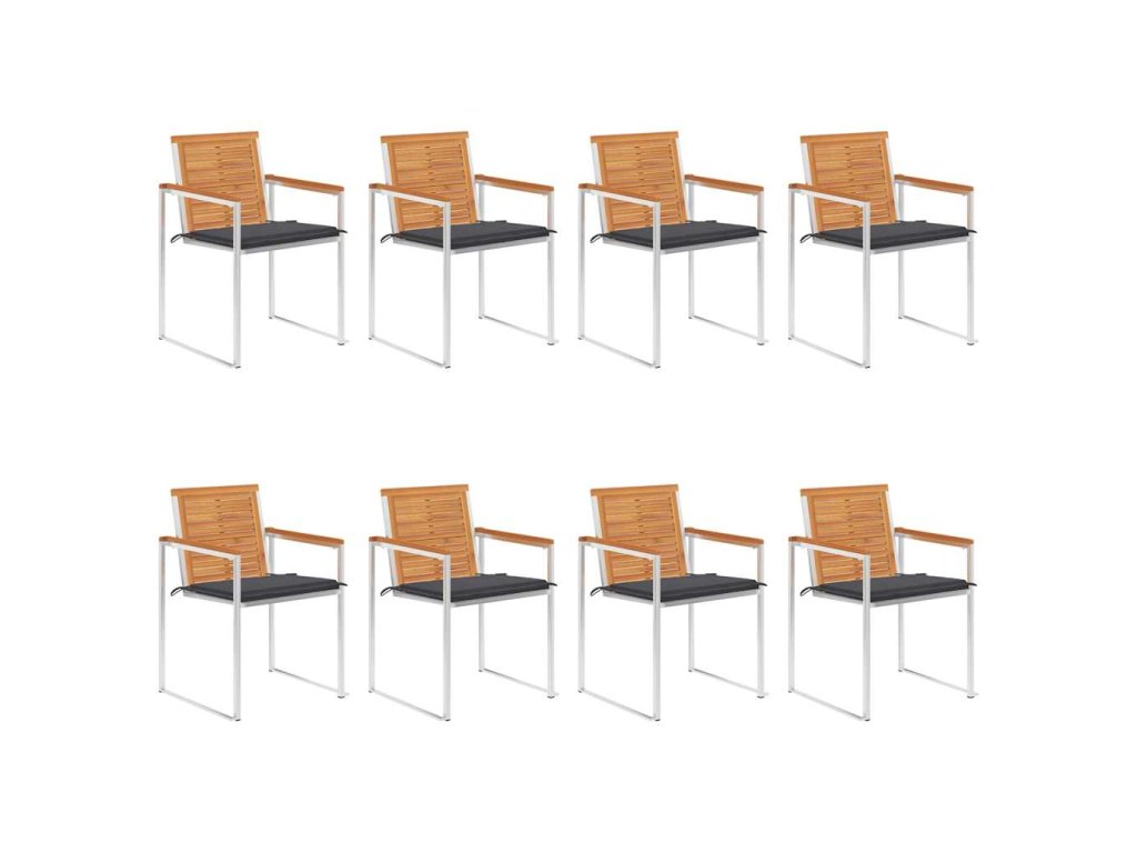 Jídelní židle jsou vyrobeny z masivního akáciového dřeva a vysoce kvalitní nerezové oceli, takže jsou vysoce odolné, nerezavějící, robustní a snadno se čistí vlhkým hadříkem. Přiložená poduška je více než jen praktickým doplňkem, plní také dekorativní funkci. Posaďte se k příjemné večeři pod širým nebem nebo jen relaxujte a užívejte si počasí s touto klasickou sadou zahradních židlí.