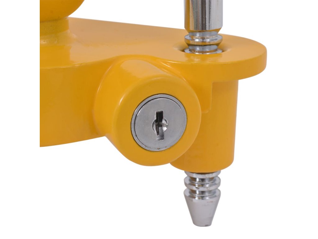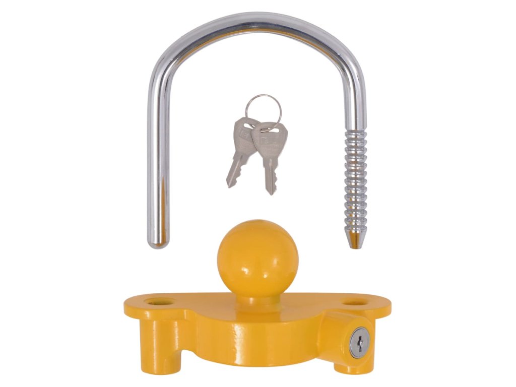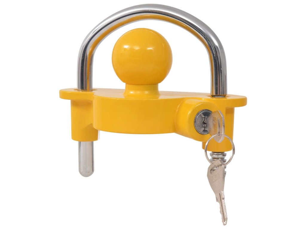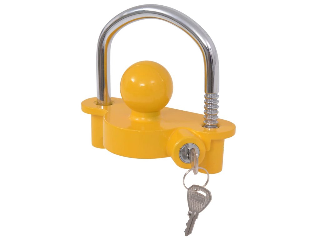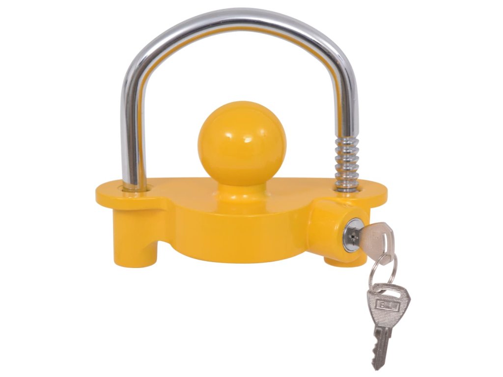 Tento zámek přívěsu je zkonstruován z třmene z vysoce odolné oceli a tělesa z hliníkové slitiny, které bylo opatřeno žlutým práškovým nástřikem, aby se zabránilo rezavění a zvýšila se jeho odolnost vůči povětrnostním vlivům. Je snadné zamknout svůj přívěs. Jednoduše odblokujte lištu pomocí klíče a vytáhněte ji tak, aby se kulička dostala do háku přívěsu, a pak ji opět zamkněte.