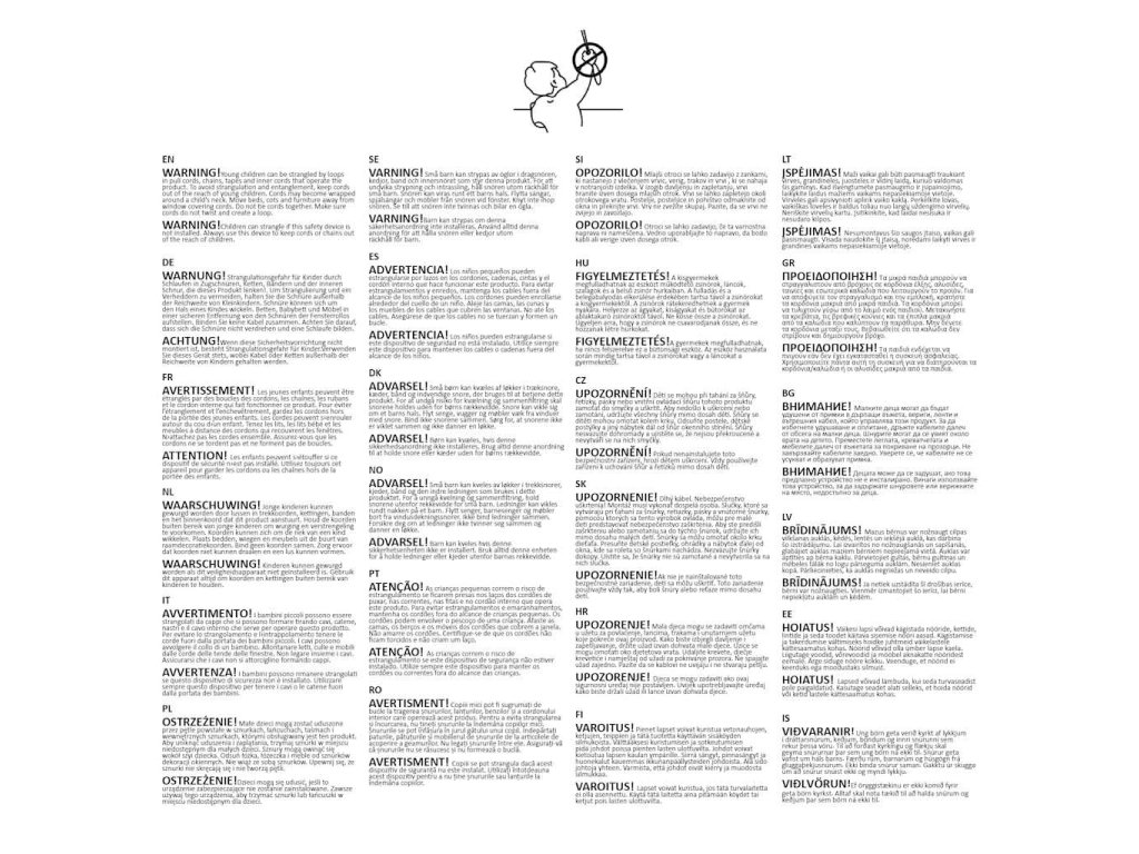 VAROVÁNÍ: Malé děti se mohou uškrtit smyčkami v tažných šňůrách, řetízcích, páskách a vnitřních šňůrách, které ovládají výrobek. Abyste předešli uškrcení a zamotání, uchovávejte šňůry mimo dosah malých dětí. Šňůry se mohou dítěti omotat kolem krku. Přesuňte postele, dětské postýlky a nábytek dále od šňůr okenních krytin. Nesvazujte šňůry k sobě. Ujistěte se, že se šňůry nekroutí a netvoří smyčku.