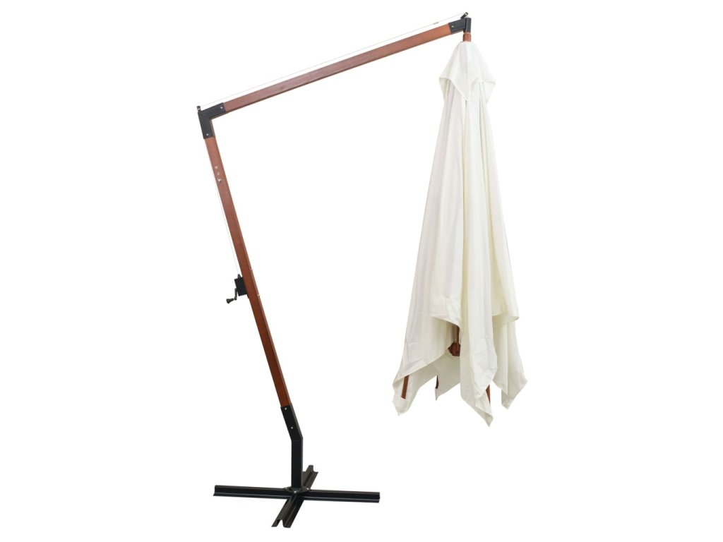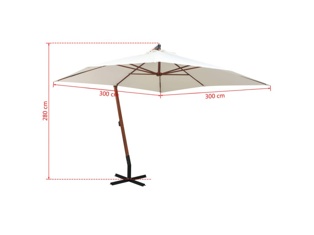 Tento elegantní závěsný dřevěný slunečník na zahradu ve vysoké kvalitě je skvělým pomocníkem, který vám poskytne stín a ochrání vás tak před škodlivým UV slunečním zářením. Vy si tak můžete užívat s rodinou chvilky pohody na dvoře, terase či na zahradě. Slunečník bude zároveň výrazným doplňkem vašeho venkovního posezení.
